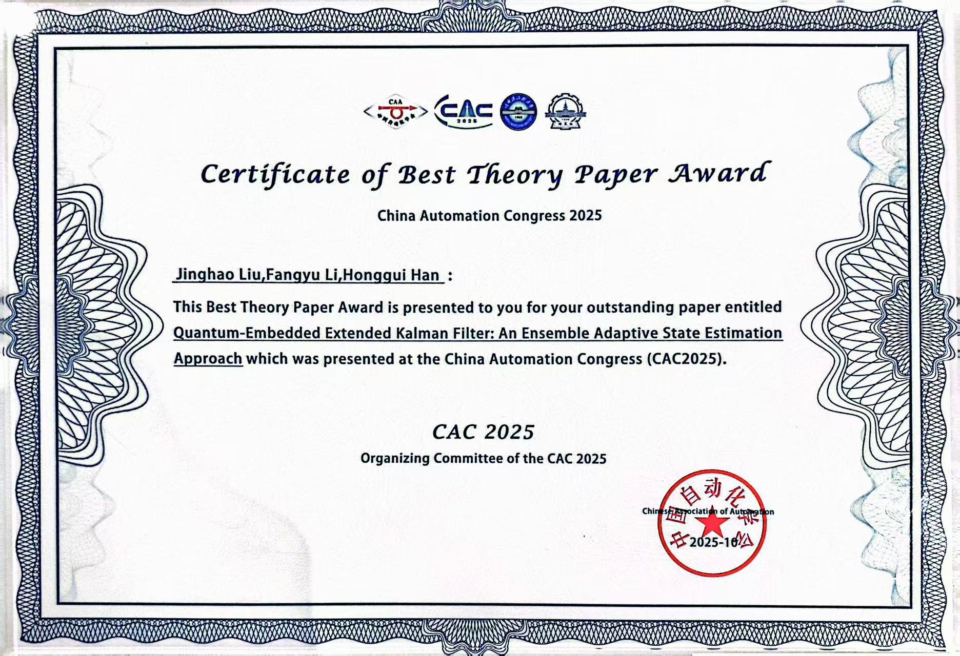 Congrats to Jinghao Liu for winning the Best Theory Paper Award of China Automation Congress (CAC2025).